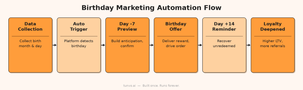 Anniversary messages — like those tied to a customer’s “join date” with your VIP program — boost guest return rates by up to 30%, and when tied to a broader loyalty program, they can increase customer lifetime value by 20–40%. The birthday campaign is typically the entry point: it collects the data (birth date), creates a memorable touchpoint, and establishes a pattern of personalized communication that customers come to expect and appreciate.