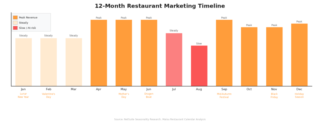 For Chinese restaurants in New York, the cultural calendar adds a layer of anchor dates that most competitors don’t have: Lunar New Year (late Jan/early Feb), Mid-Autumn Festival (September/October), Dragon Boat Festival (June), and Qingming. These are occasions when your target audience specifically wants the food you serve, often for a celebratory group meal. They should be your highest-priority marketing moments.