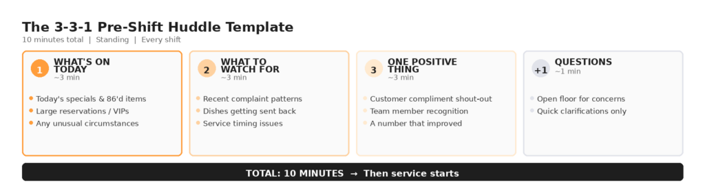 - Pre-shift huddles (5–10 minutes daily) are more effective than monthly all-hands meetings for most restaurants.