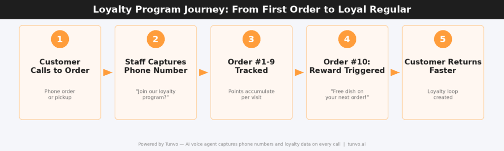 This is where an AI voice agent changes the equation. When every call is handled consistently, the system can ask for and confirm a caller’s phone number every time — linking the order to their loyalty record without staff having to remember. Every phone order becomes a loyalty data point, and no customer falls through the cracks during a Friday rush. If you’re building out your takeout loyalty infrastructure, Tunvo’s AI voice agent handles the phone order flow so your team can focus on the counter — and every caller gets the loyalty enrollment prompt, every time.