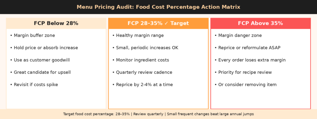 | FCP above 35% | Raise price or rework recipe to reduce cost | Every order at this margin is costing you margin |