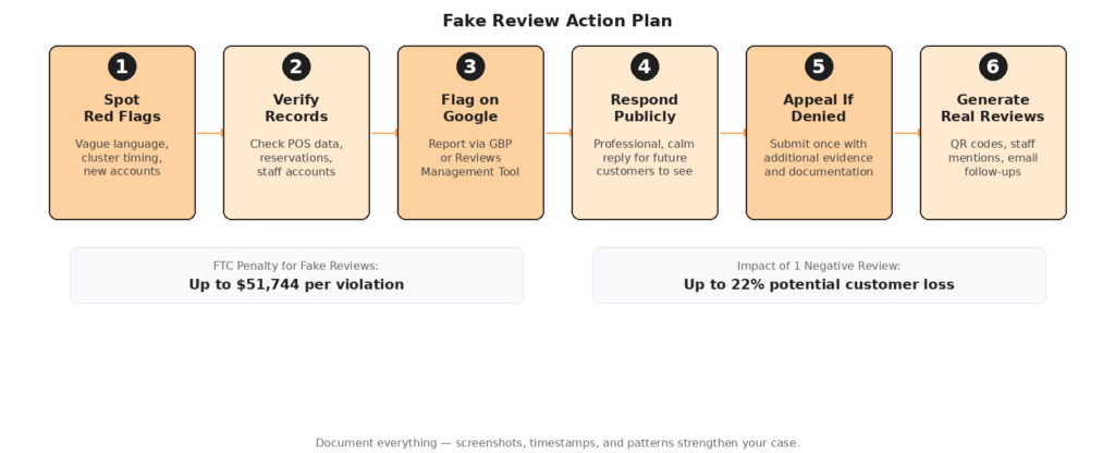 Potentially, yes. Under the FTC’s Consumer Review Rule, posting fake reviews is a federal violation with penalties up to $51,744 per instance. You could also pursue state-level defamation or unfair business practices claims. However, legal action is expensive and time-consuming — for most restaurants, the practical approach is to report through Google, respond professionally, and outpace the fakes with genuine reviews.