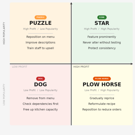 The options for Plow Horses are: raise the price carefully (testing customer sensitivity), reformulate the recipe to reduce ingredient cost without noticeably changing the dish, or reposition the item on the menu to reduce ordering frequency while focusing attention on higher-margin alternatives. Abruptly removing a Plow Horse is usually a mistake — customers notice the absence of a beloved item. A gradual price increase of $1–$2 per repricing cycle is a better path.