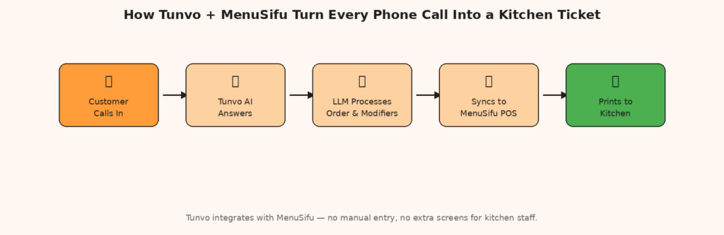 - Tunvo’s deep integration with MenuSifu means phone orders flow directly into your existing MenuSifu POS — no manual re-entry, no middleware.