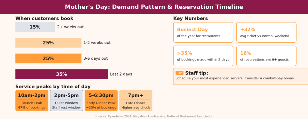 Prioritize the 10:30am–1pm brunch window and the 5–6pm early dinner window — those are where the bulk of bookings concentrate. Over 40% of Mother’s Day bookings fall between 11am and 2pm, with a significant secondary peak in early evening from families with young children. Staff and inventory for both peaks rather than assuming one will dominate.
