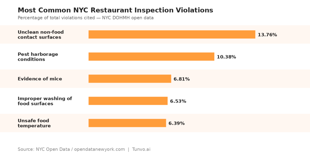 Analysis of NYC’s open inspection data consistently shows the same categories at the top of the violation list. Unclean non-food contact surfaces account for 13.76% of all violations cited, pest harborage conditions for 10.38%, and evidence of mice for 6.81%. Improper washing of food-contact surfaces and unsafe food temperatures each account for over 6% of citations. Together, these five categories represent roughly half of all violations written in New York City.