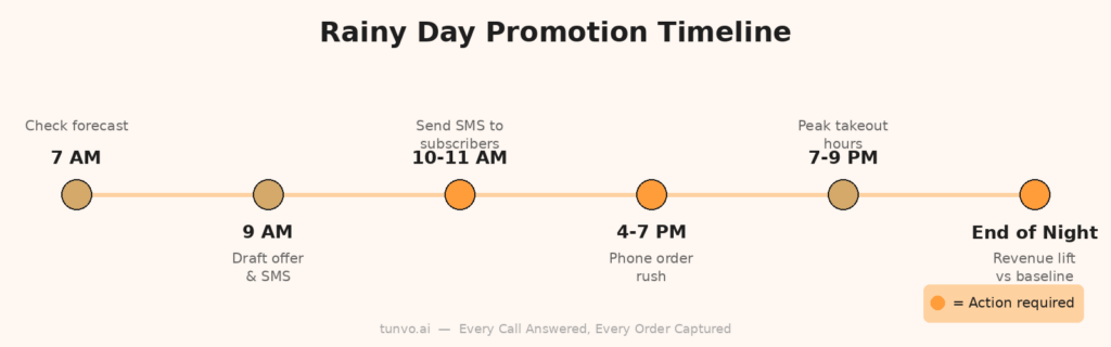 - Rainy days shift demand from dine-in to delivery and takeout — a direct opportunity for phone-order-heavy restaurants.