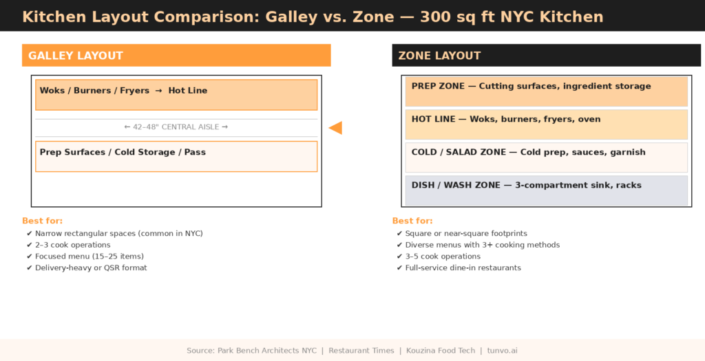 - The galley layout is the single best fit for narrow NYC restaurant spaces — two parallel walls of equipment with a central aisle maximize output per square foot.