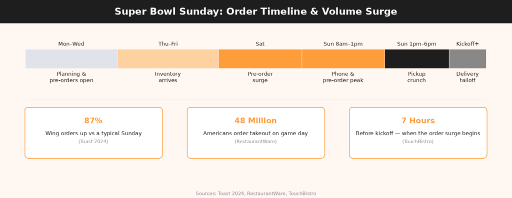 - Wing orders on Super Bowl Sunday surge dramatically — restaurants that pre-sell in bundles control their production and reduce chaos at the counter.