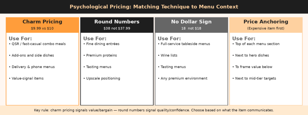 Charm pricing carries a signal: “this is a value-oriented purchase.” That’s the right signal for a combo meal. It’s the wrong signal for a $38 duck confit at an upscale restaurant.