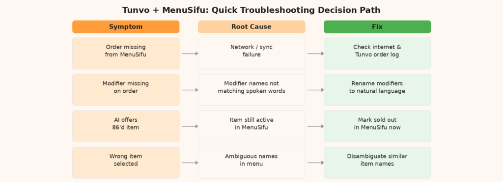 You’ve set up Tunvo’s AI voice agent on your MenuSifu POS. Most of the time, it works exactly as intended — calls come in, the AI takes the order, and the ticket appears in your kitchen. But occasionally something doesn’t line up: a modifier doesn’t show up correctly, an item the AI thought was available had been 86’d, or an order simply doesn’t appear. This guide covers the most common issues restaurant operators encounter when running voice AI on MenuSifu, with step-by-step fixes and the logic behind why each problem occurs.