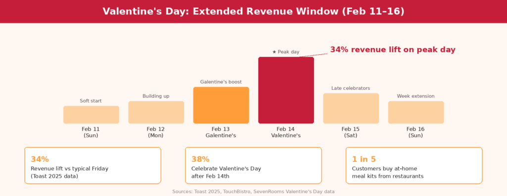 Not all Valentine’s Day revenue comes from couples sitting at your tables. Toast data found that takeout orders increased 19% on Valentine’s Day 2025 compared to the average Friday, while delivery grew 11%. A meaningful segment of couples — those with young children, those who prioritize privacy, those avoiding the crowds — specifically want a restaurant-quality Valentine’s meal at home.