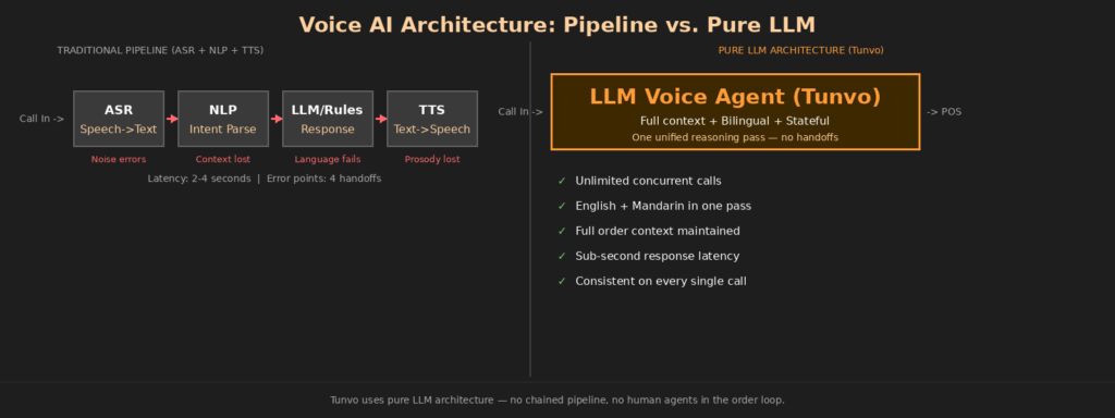For Chinese restaurants specifically, LLM-based systems handle code-switching — when a speaker moves between English and Mandarin mid-sentence — in a way that traditional ASR + NLP pipelines struggle with. Traditional systems typically need language-specific models that are routed to when language is detected. Code-switching confuses the detection layer, producing routing errors. An LLM trained on multilingual data handles mixed-language input as a single context, without the routing step.