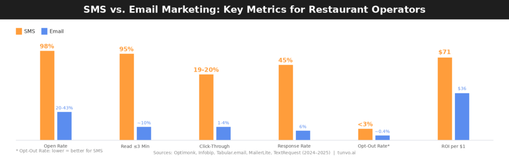 That gap — between email and SMS — isn’t marginal. It’s structural. And for independent restaurants that depend on repeat customers and time-sensitive promotions, understanding why it exists (and how to use both channels strategically) is one of the highest-leverage marketing decisions you can make.