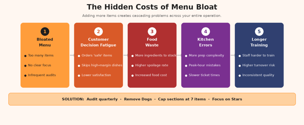 The customer experience problem is real, but the operational cost of menu bloat is just as significant. Every item you add to your menu creates downstream complexity that affects every part of your restaurant.